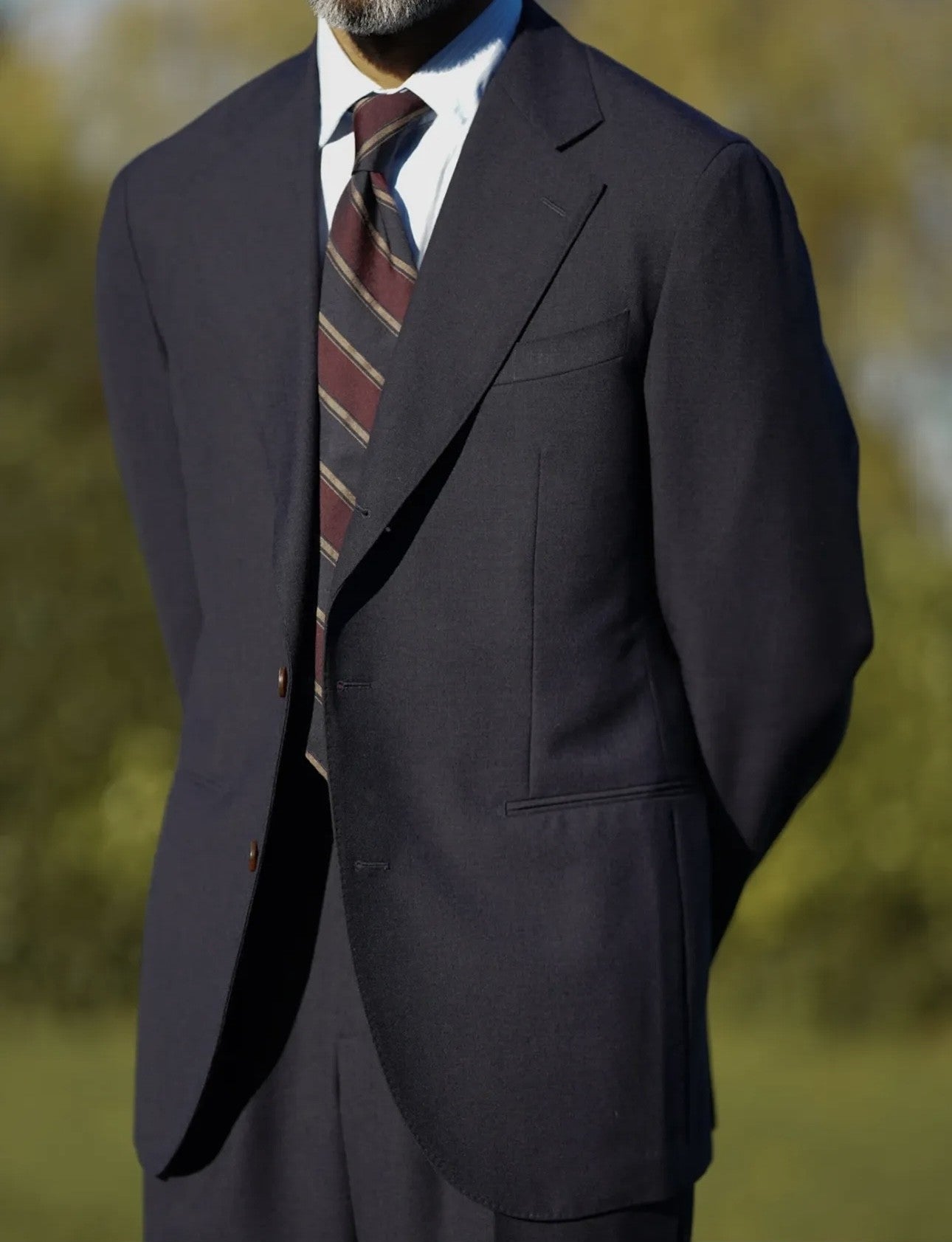 Comfort Soft Fit Jacket has thinner shoulder pads and the lapel is 10cm seating slightly lower than our neapolitan fit, it conveys a more traditional and classic look. The sleeve head is made with the "spalla camicia" technic (also called "shirt sleeve"), which means the sleeve-head is natural and not roped. It features larger shoulders which gives a soft round look. It is recommended for single blazers or relax suiting.